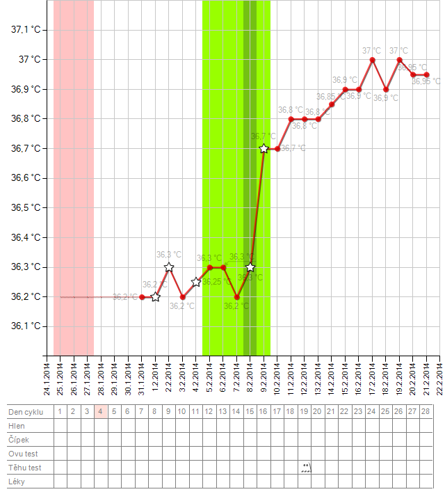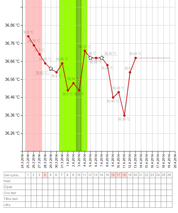 Ahoj holky, můžete se mi někdo kouknout na graf? Byla jse 8DC na UTZ, měla jsem cystu 37m a folikul 8mm, takže ovulace asi nebyla, i když je tam vyznačená. 16DC jsem čekala ovulaci a začala jsem špinit, přešlo to do MS, která zkončila 12.4. Vůbec nechápu co ty teploty, které pořád stoupají, po MS mívám tak do 36,4.°C. Minulý cyklus jsem měla nasazený clostilbegyt, tak jestli se už moje tělo úplně zbláznilo?