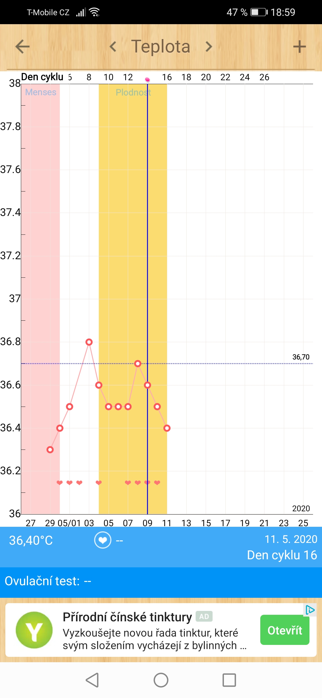 12.5.2020 7:58A byla v posledním cyklu ovulace? Třeba šlo o anovulační cyklus a tím pádem přišla ms "dříve".... Toto bych viděla jako "obyčejný" graf....prostě folikulární fáze...uvidíš, co bude dál...