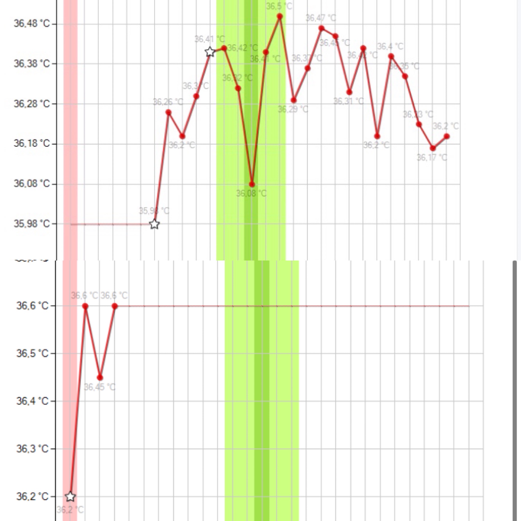 • No pravidlo 3 po 6 nevzniklo :( nie sú vidieť dni takže neviem či tá spodna časť obrazku je po prvom a kolko dní ubehlo v mrške (červená zona), ale tie zvyšenie teploty můžou ukazovať Ovku,mohla byt ten posledný den krvácania. akonáhle budeš mať 3 dni vyššiu teplotu, než predošlých 6 dní, to je potvrdenie ovky :) Na prvom obrazku síce pokles pekný je, ale neprebehla- Taktiež samozrejme ale nemuselo sa merať v rovnakych podmienkach, graf máš dosť skákavý.. :)