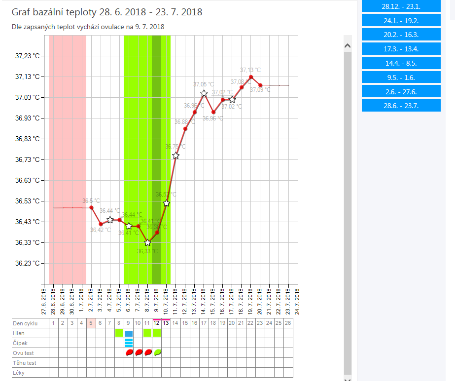 20.7.2018 17:51Je to pekny graf..ale o tehotenstvi zatim nevypovida...je to brzy...teplota ti muze klesnout ze dne na den...zatim se drzi. Test uz by ti mohl ukazat dusika.