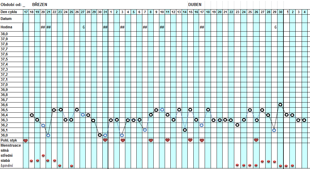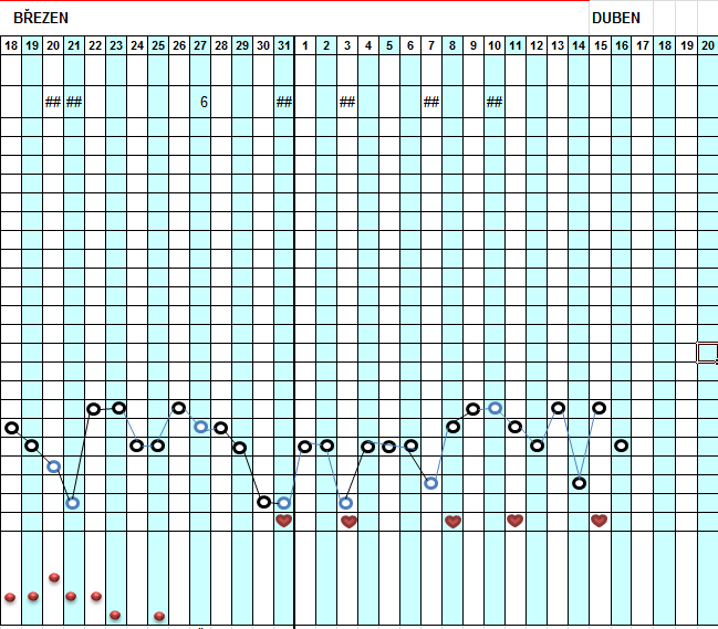 16.4.2014 20:22Holky kdo mi poradí? HA jsem vysadila v listopadu minulý rok, od té doby jsem nedostala MS 100 dní tak jsem byla na vyvolávačce, MS přišla 1.3.2014 poté znovu 18.3. od toho dne si vedu graf bazální teploty, myslíte že mám ovulaci nebo je anovulační? Já ji tam nevidím..otěhotnět nechci ale už ani nedoufám že MS zase přijde sama. Přikládám obrázek, (modré kolečka jsou to kdy jsem musela vztát dříve a teplota tak byla naměřená v jinou dobu) měřím v ústech min. teplota 36,0 a max. 36,5
