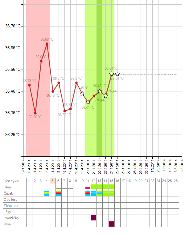 Ahoj holky, jdu sem zase pro radu. Můžete mi poradit kdy byla ovulace? Byla jsem na UTZ 23.4. a folikul byl 21mm, takže ta vyznačená ovulace v grafu určitě nebyla. Zatím mi ale teploty nestouply, tak nevím...