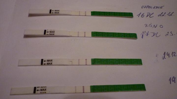 27.12.2013 19:18Podle testů to nevypadá. Ale nejsilnější je ten ze 17DC a máš u něj napsaný ráno...... Jak hodně brzo ráno jsi testovala? Nemělo by se testovat před 10h, protože LH hormón je v moči v nižší koncentraci. Takže jestliže jsi testovala před 10h, tak po tý 10h mohla být čárka už stejně silná nebo silnější a tudíš testík pozitivní