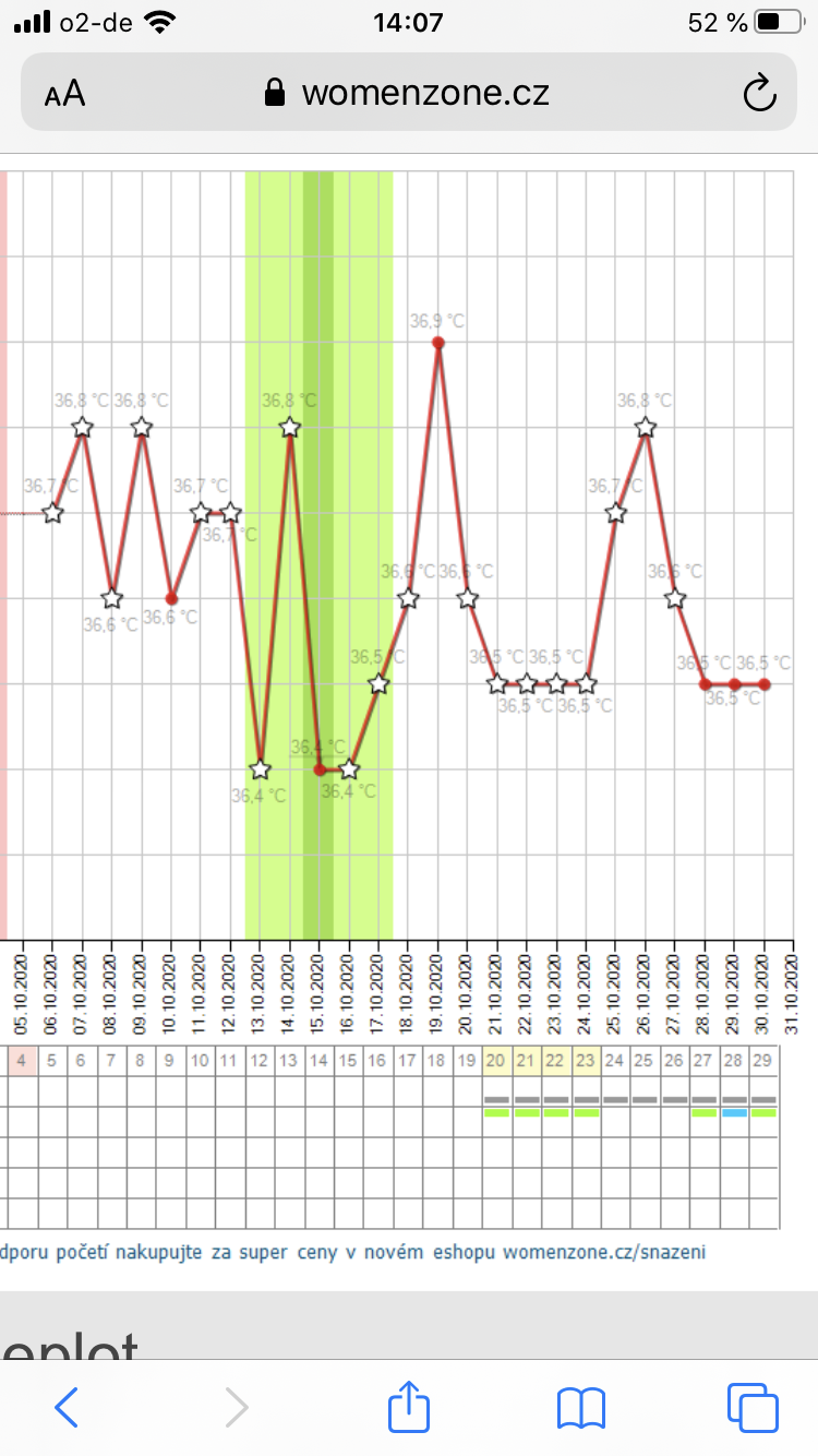 Dobré odpoledne, moc rada bych byla kdyby jste mi některá poradila s mým grafem. Dle mého asi ovulace proběhla 24.10. (Doprovázeno pícháním v podbřišku, plodný hlen, čípek měkký a vysoko) ale zaráží mě ta teplota. Mám PCO. Mockrát děkuji za odpovědi.