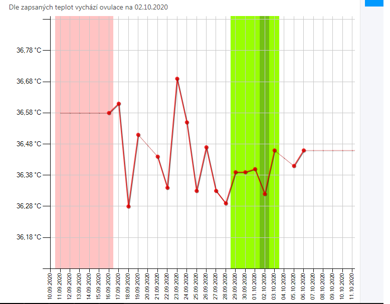 6.10.2020 15:15Také bych řekla, že ovulace ještě neproběhla. Ovulace byla označena, protože byl pokles a větší vzestup. Ale graf se bude stále měnit s měřenými hodnotami.