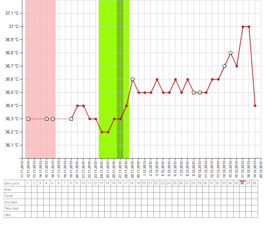Holky potřebuju poradit ikdyž jsem něco vyčetla na netu…dnes mi BT z 37 klesla na 36,4 (takovou mívám v době před ovulací-teplotu v tu dobu mívám od 36,2-36,4) potom mi asi na 15 dní vyskočila na 36,5-36,6 (to mi graf vyhodnotil ovulaci na 27,11) ale potom mi zase vyskočila na 36,7-37 a to mi pár fajn ženských rěklo že to vypadá jako typický těhotenský graf tak že můžu zkusit testovat tak jsem byla uplně šťastná ale testy jsou pořád negativní tak mě napadlo, že ovulace mohla být teprve 13,12 a teď ten pokles zpátky na 36,4 no a někde jsem vyčetla že tento pokles může být při uhnizďování vajíčka tak se chci zeptat jestli se vajíčko může uhnízdit už po 6 dnech :) přikládám graf :)