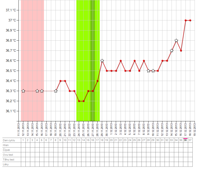 Ahojky holky, mám otázku :) podle grafu tady mi ovulace vychází na 27,11, jenže včera jsem zkusila testovat a nic, no ale všimla jsem si, že se mi zase začala zvyšovat teplota, normální teplotu mívám od 36,2-36,4 a pak mi 15 dní přeskakovala mezi 36,5 a 36,6 a to mi graf vyhodnotil ovulaci na toto 27,11 no ale teď jsem měla teplotu včera 36,7 a dneska dokonce 36,8 myslíte že mohla ovulka teprve být kolem toho 13?? Test jsem dělal kvůli 5-ti dnům zpoždění a vyšší teplotě, cyklus mívám zhruba 28 dní :) Graf přikládám :) moc díky :) jinak ještě poznámka ze grafu: nemám doplnění veškerý sex :D protože čekám otázky a z čeho by jsi chtěla otěhotnět když tam nemáš sex? :D sex v tu dobu určitě byl protože s přítelem spolu spíme skoro každý den :D