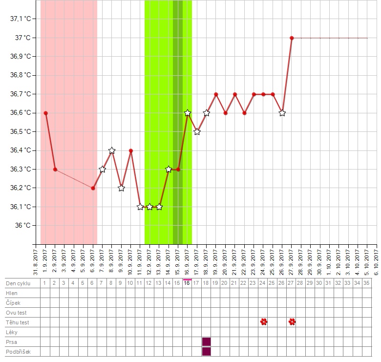 27.9.2017 18:00Podle BT bych řekla, že jsi od ovulace tak 11dni a na test tudíž mohlo byt brzy. Testujeme znovu za 2 dny.